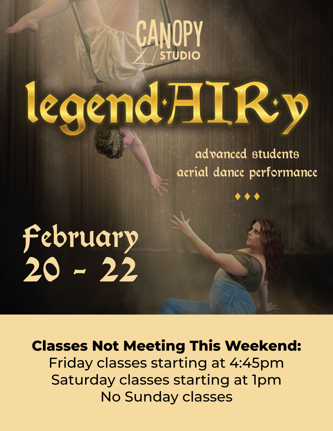 posted 1/21/2026 The advanced students present their aerial dance performance, “legendAIRy,” on February 20-22. Tickets are available online. Showtimes:Friday @ 8pmSaturday @ 4pm & 8pmSunday @ 2pm